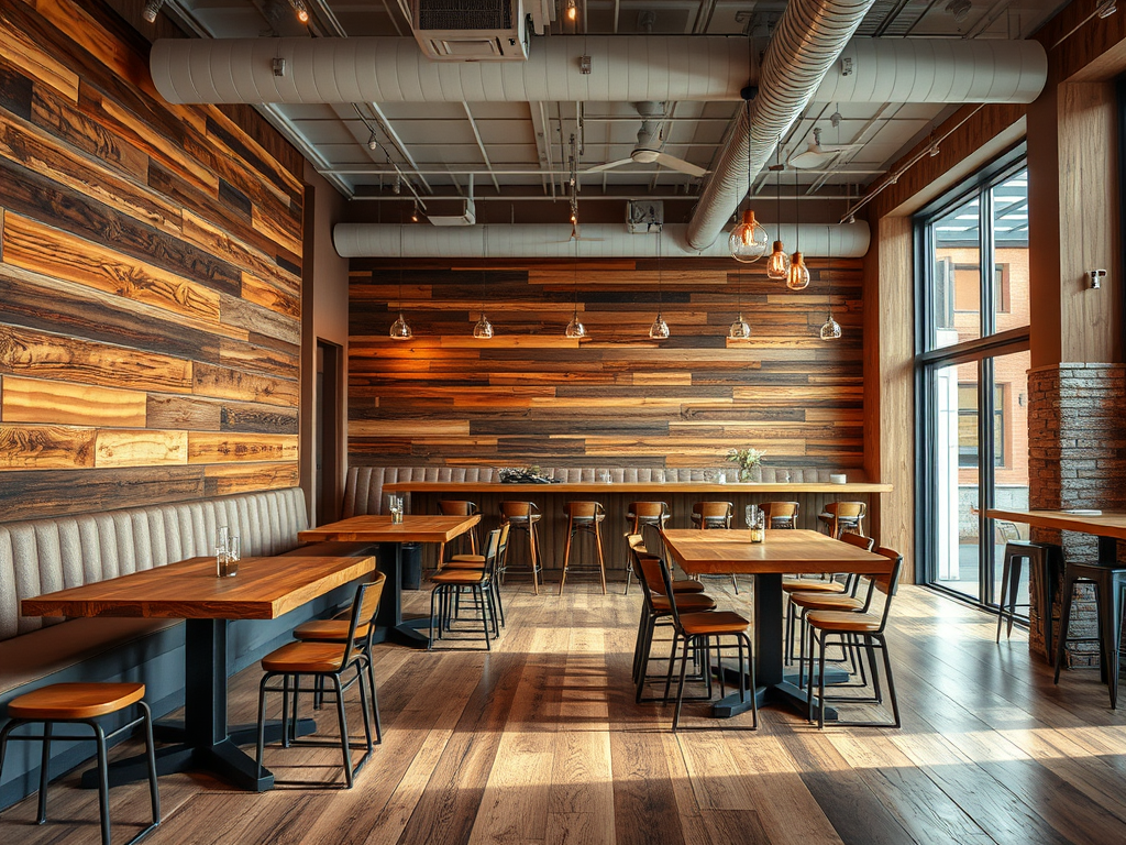 Decoração de ambientes comerciais com madeira de demolição tratada para alto tráfego